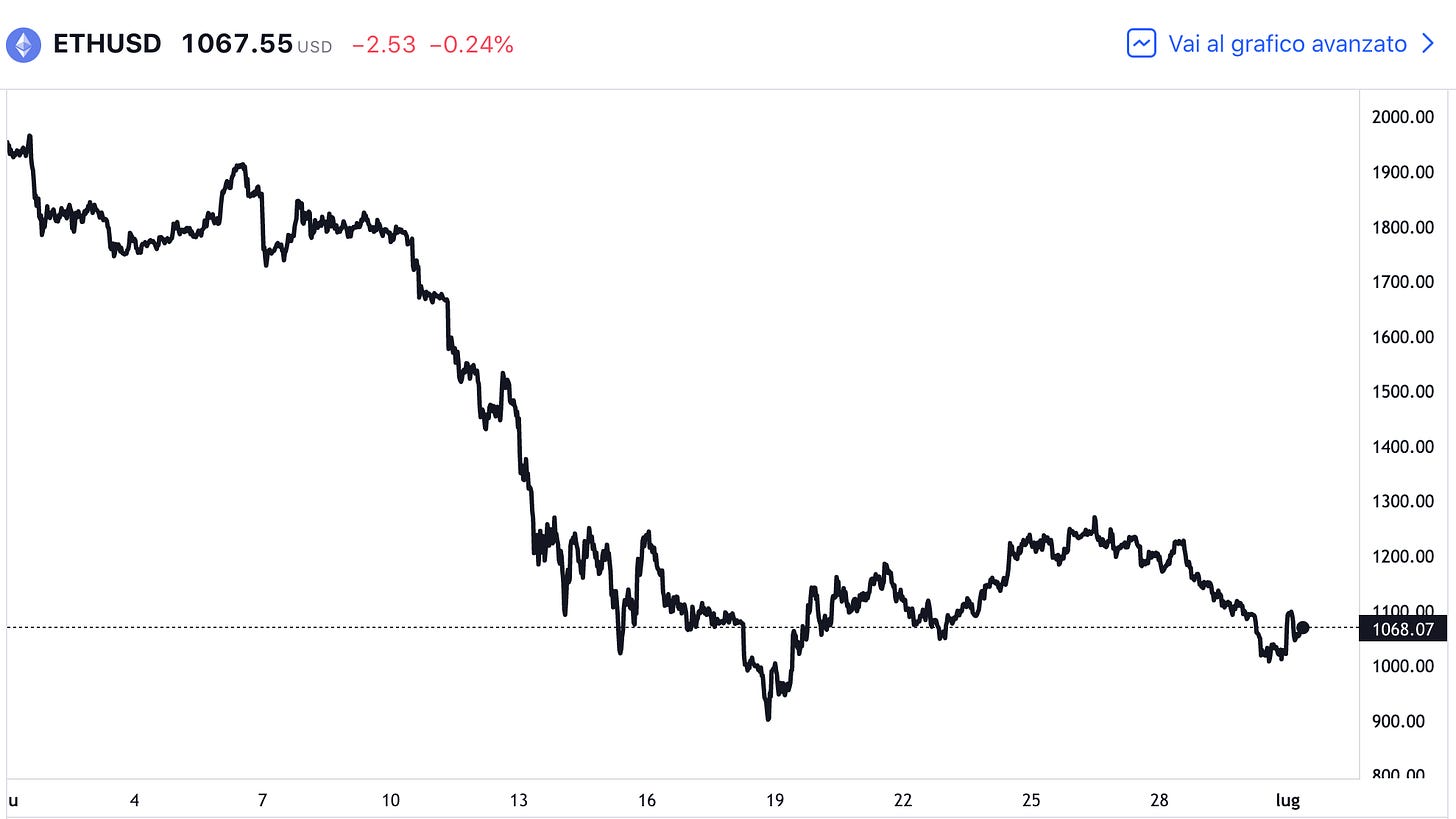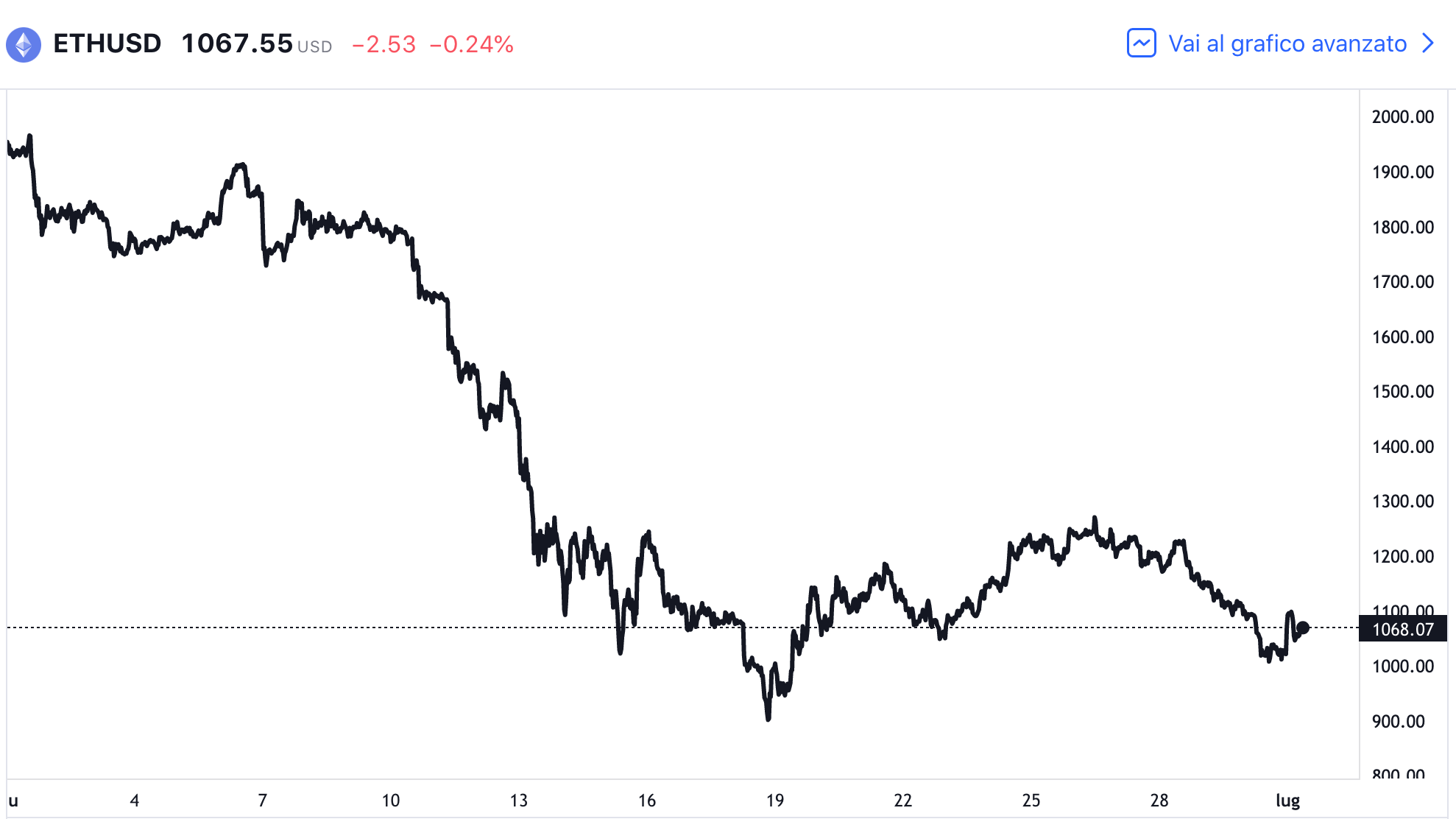 Ether segue fedelmente l’andamento di Bitcoin, tanto che i due grafici sembrano identici. Anche lui è sceso per ben due volte sotto i 1.000 dollari nel mese di giugno.