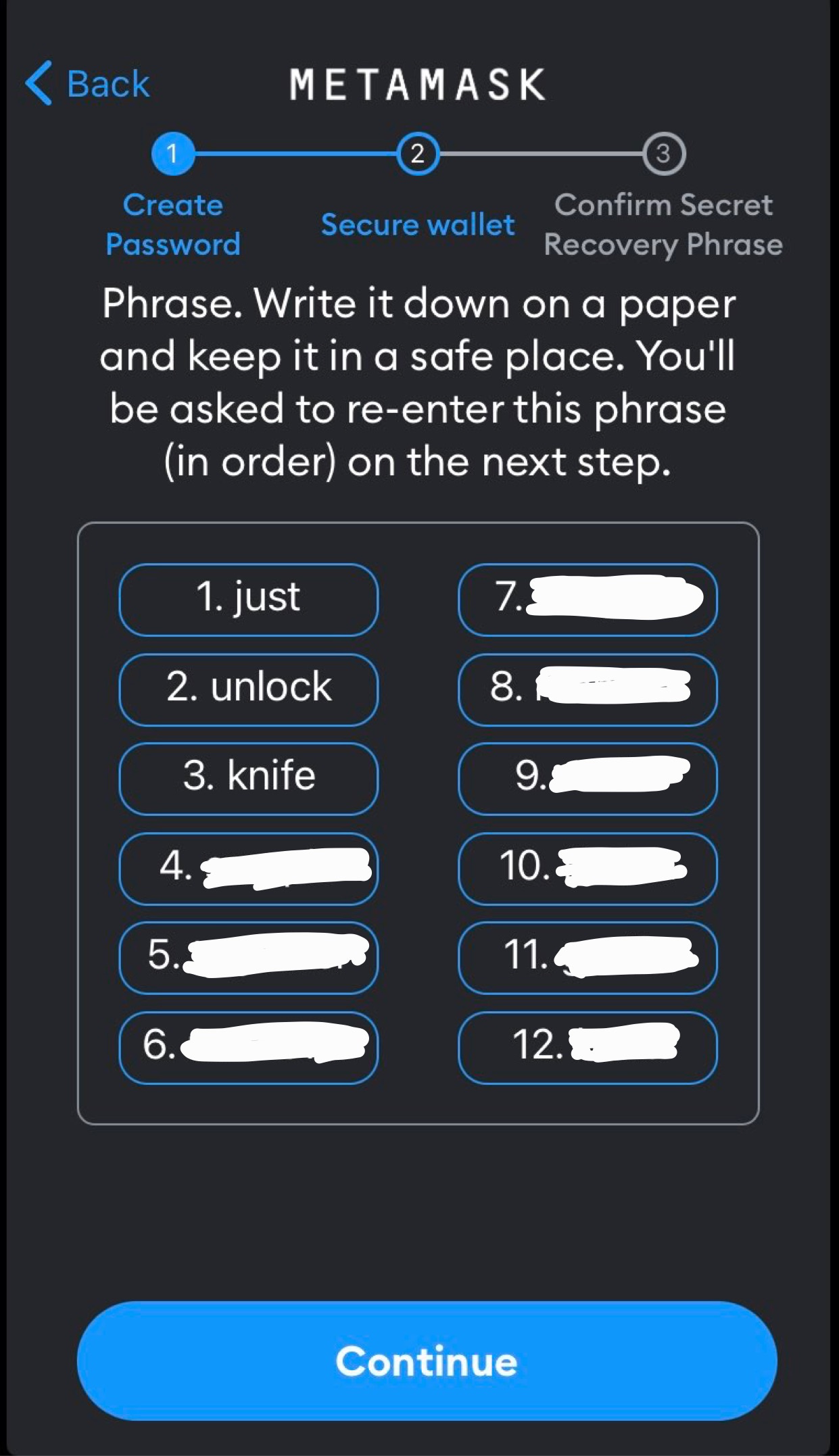 Dopodiché vi apparirà la vostra Recovery Phrase: 12 parole che messe nell’esatto ordine specifico vanno a identificare il vostro Wallet e, nel caso in cui lo abbiate perso o abbiate dimenticato la vostra password, permettono di recuperare i vostri Fondi.