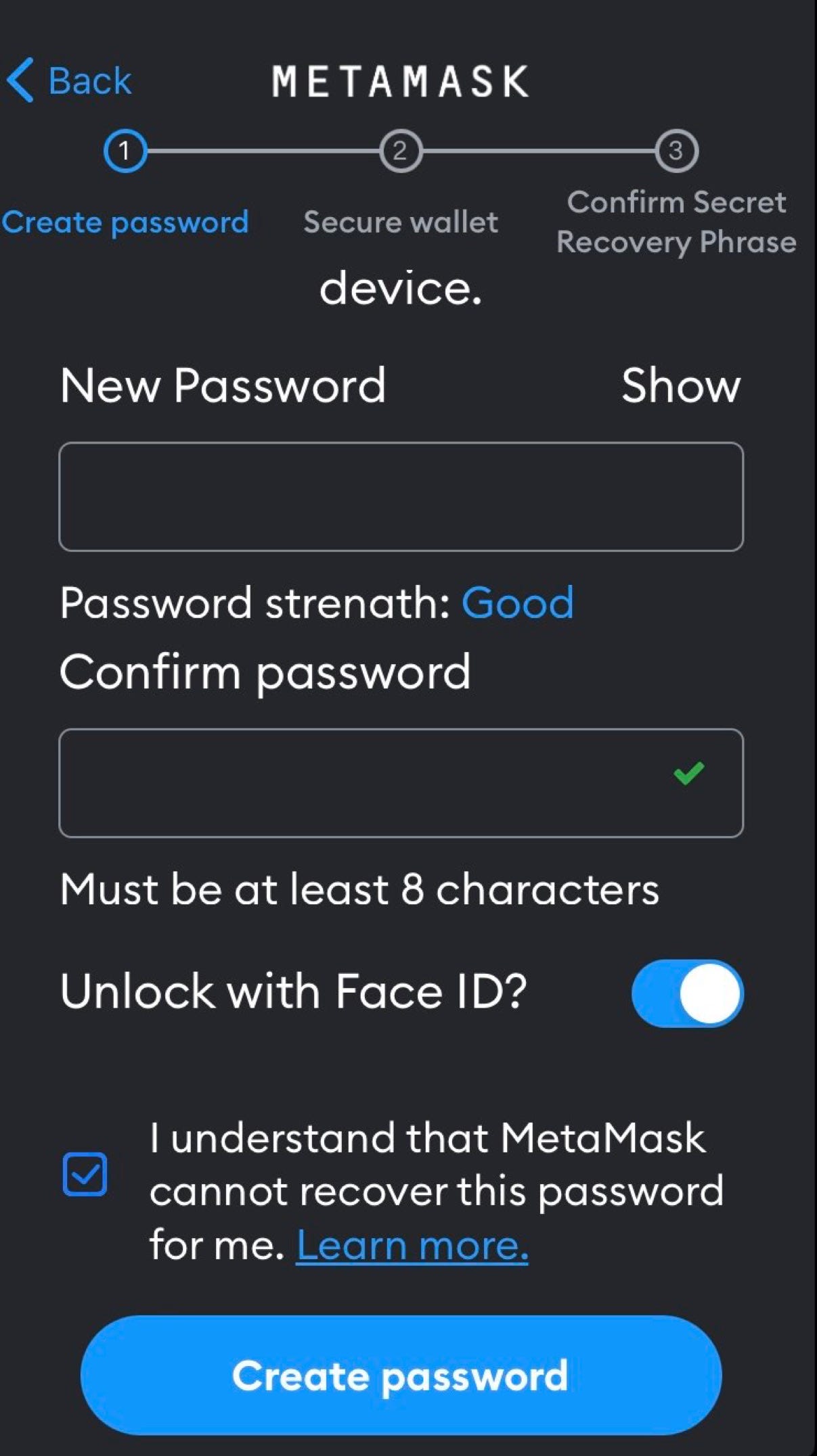 Una volta scaricata la App di Metamask vi sarà chiesto di scegliere una password.