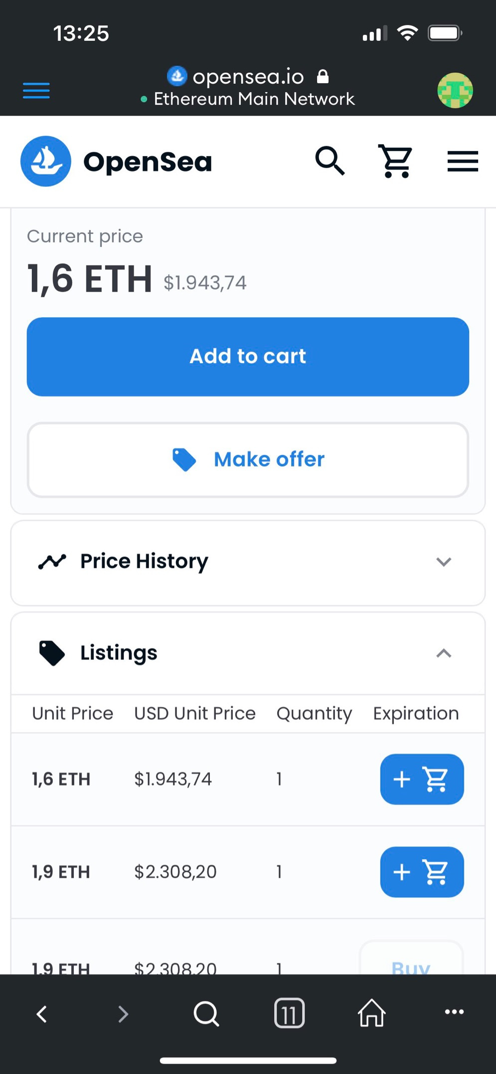 Adesso avete due possibilità. Con “Add to Cart” accettate il prezzo imposto e comprate l’NFT senza bisogno di un asta. Con il bottone “Make Offer” potete fare un’offerta inferiore e sperare che il venditore l’accetti.