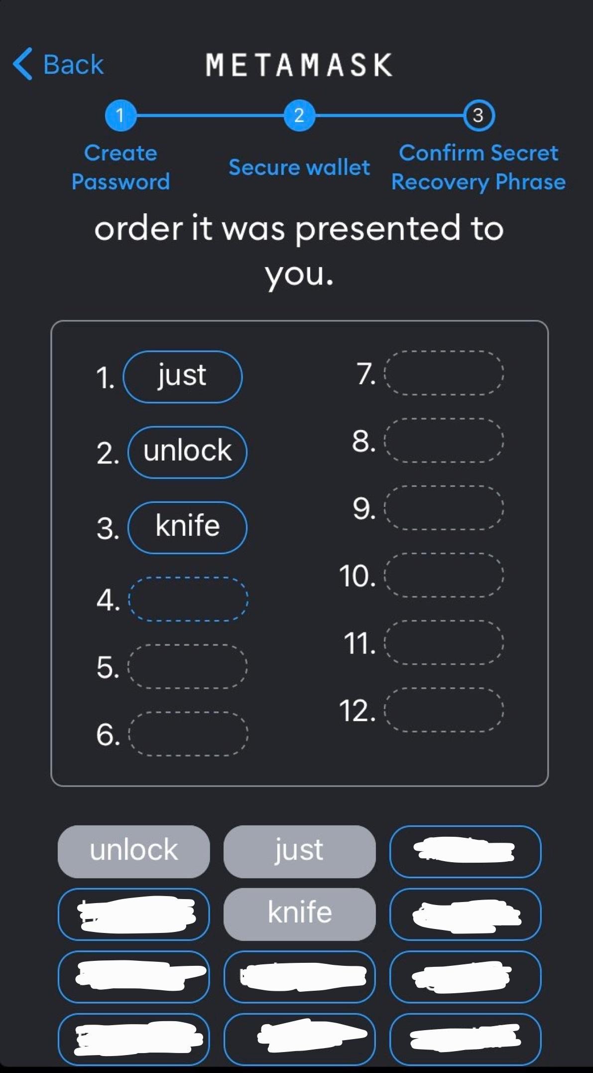 In seguito vi viene chiesto di selezionare le 12 parole nell’ordine esatto.